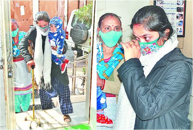 गोद में बच्चा लेकर बैसाखी के सहारे जाती शिक्षिका