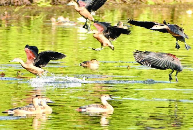चंबल में अठखेलियां करते व्हिसलिंग टील पक्षी