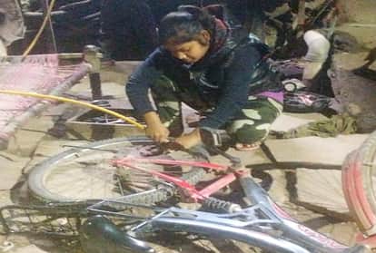साइकिल के पहिये में हवा भरतीं राजकुमारी