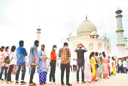 लंबे अंतराल के बाद ताजमहल पर देसी-विदेशी पर्यटकों के उमड़ने का सिलसिला शुरू हो गया है। सप्ताहांत में पर्यटकों की संख्या आम दिनों के मुकाबले डेढ़ गुना तक पहुंच जाती है। रविवार को 18 हजार से अधिक पर्यटकों ने ताजमहल का दीदार किया। मुख्य गुंबद से लेकर दोनों गेटों तक पर्यटकों की लंबी कतारें लगी रहीं। ताजमहल पर रविवार को सुबह से ही पर्यटकों की भीड़ उमड़ना शुरू हो गया। दोपहर तक पश्चिमी गेट और पूर्वी गेटों पर लंबी लाइनें लग गईं। गेटों पर चेकिंग में देरी के कारण उमस भरी गर्मी में पर्यटकों को आधा घंटे तक इंतजार करना पड़ा, जबकि गेट पर केवल सुरक्षा जांच की जा रही है। थर्मल स्क्रीनिंग आदि नहीं।