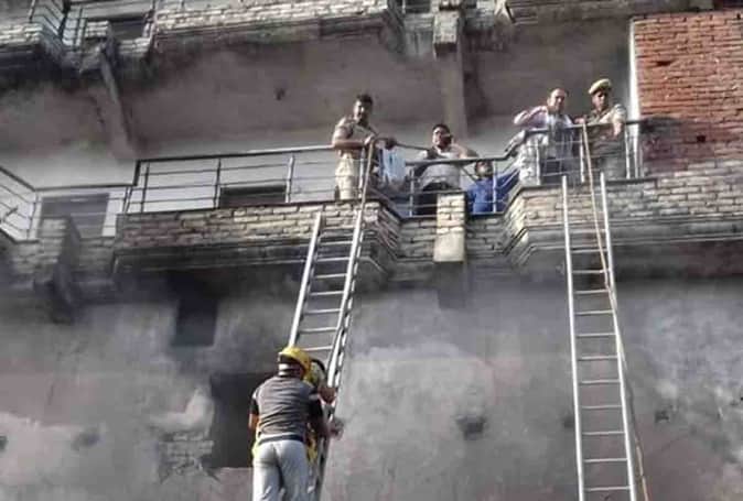 कानपुर में इमारत में आग लगने के बाद लोगों को सुरक्षित बाहर निकाला गया