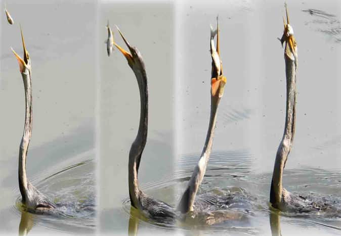 बगुला प्रजाति के इस ग्रे हेरॉन पक्षी के शिकार करने का अंदाज बिल्कुल अलग है। यह पहले पानी के अंदर से मछली को बाहर लाता है।