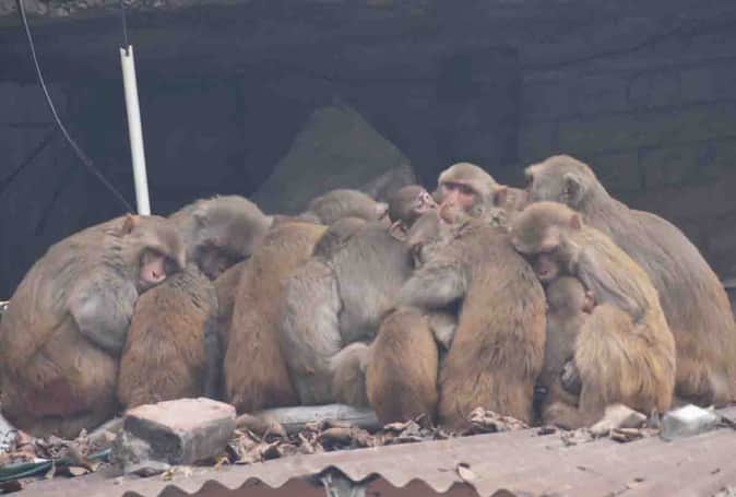 भीषण ठंड से बचने के लिए एक साथ बैठा बंदरों का झुंड