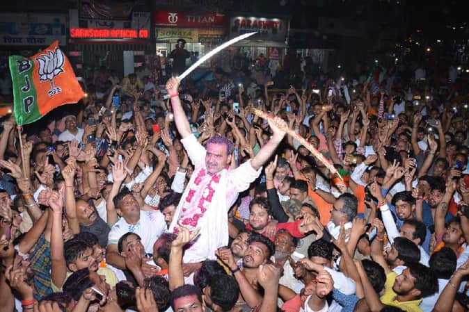 लोकसभा चुनाव में केसरिया लहराने की खुशी में भाजपा कार्यकर्ताओं ने जोश और नारेबाजी के बीच शहर में जश्न मनाया। पूर्व केंद्रीय राज्यमंत्री डॉ संजीव बालियान के साथ शहर के मुख्य मार्गों से जीत का जुलूस निकाला गया। इस दौरान संजीव बालियान ने जीत के बाद तलवार भी लहराई। आगे देखें तस्वीरें:-