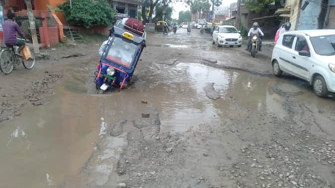 यूपी: दौड़ते-दौड़ते गिर गए वाहन, सड़कों में हुए गड्ढे में भरा बारिश का पानी
