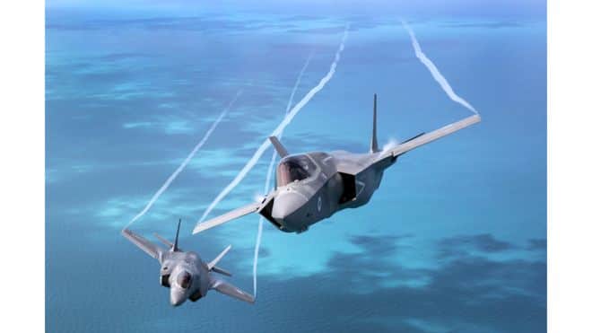 इंग्लैंड के पूर्वी तट पर आसमान में कलाबाजियां दिखाते दो एफ-35बी जेट की तस्वीर इस साल रॉयल एयर फोर्स फोटोग्राफिक प्रतियोगिता के लिए चुनी गई कई तस्वीरों में से एक है। इसके फोटोग्राफर टिम लॉरेंस हैं।