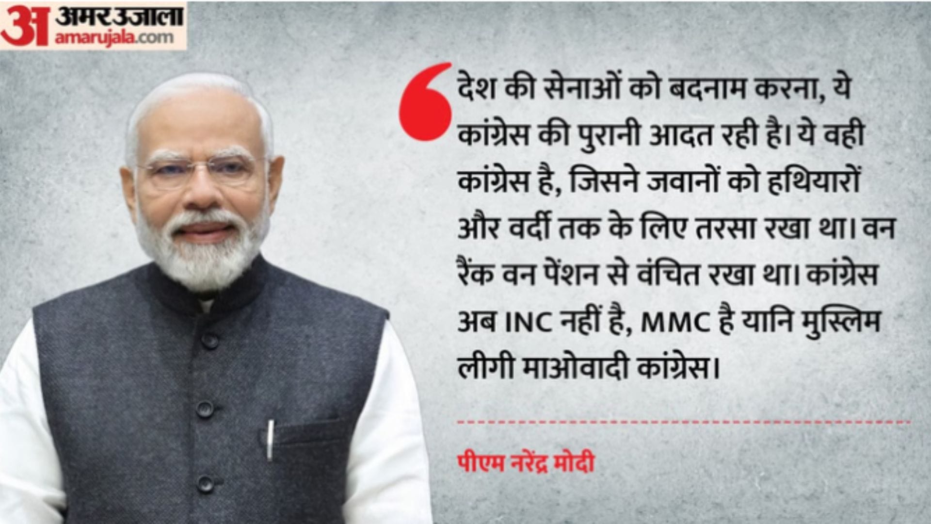 पीएम मोदी ने अजमेर में शनिवार को कहा कि कांग्रेस भी घात लगातार देश को बदनाम करने के लिए कहीं भी घुस जाती है। कांग्रेस के ऐसे कुकर्मों को देश कभी माफ नहीं करेगा। देश को बदनाम करना, देश की सेनाओं को बदनाम करना, ये कांग्रेस की पुरानी आदत रही है। ये वही कांग्रेस है, जिसने जवानों को हथियारों और वर्दी तक के लिए तरसा रखा था। वन रैंक वन पेंशन से वंचित रखा था। कांग्रेस अब INC नहीं है, कांग्रेस अब MMC है यानि मुस्लिम लीग माओवादी कांग्रेस।