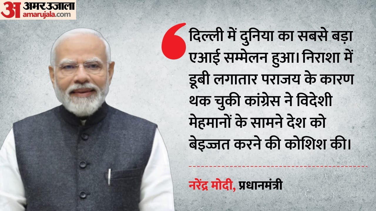पीएम नरेंद्र मोदी ने कांग्रेस पर आगे निशाना साधते हुए कहा कि साथियों हाल ही में दिल्ली में दुनिया का सबसे बड़ा एआई सम्मेलन हुआ। इसमें दुनिया के अनेक देशों के पीएम-राष्ट्राध्यक्ष, मंत्री आए। दुनिया की बड़ी-बड़ी कंपनियों के लीडर एक छत के नीचे इकट्ठे हुए। भारत की खुले मन से प्रशंसा की। अब दुनिया के इतने लोग भारत की प्रशंसा करते हैं तो अपको गर्व होता है या नहीं होता है। अभिमान होता है या नहीं। आपका सीना ऊंचा होता है या नहीं। साथियों आपको गर्व हुआ, लेकिन हताशा, निराशा में डूबी लगातार पराजय के कारण थक चुकी कांग्रेस ने क्या किया? दुनिया भर के मेहमानों के सामने देश को बदनाम करने की कोशिश की। इन्होंने विदेशी मेहमानों के सामने देश को बेइज्जत करने की कोशिश की।