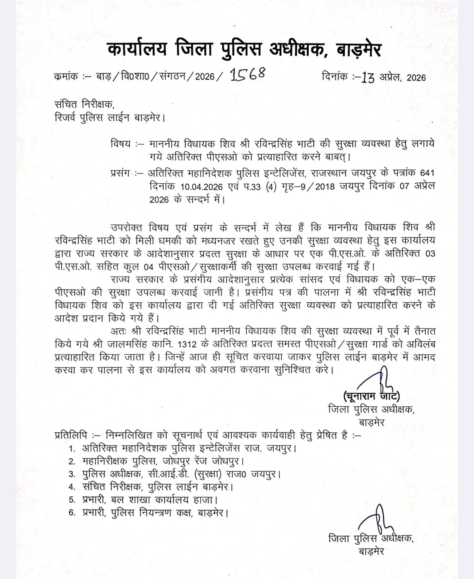 विधायक रविन्द्रसिंह भाटी की सुरक्षा व्यवस्था में बड़ा बदलाव