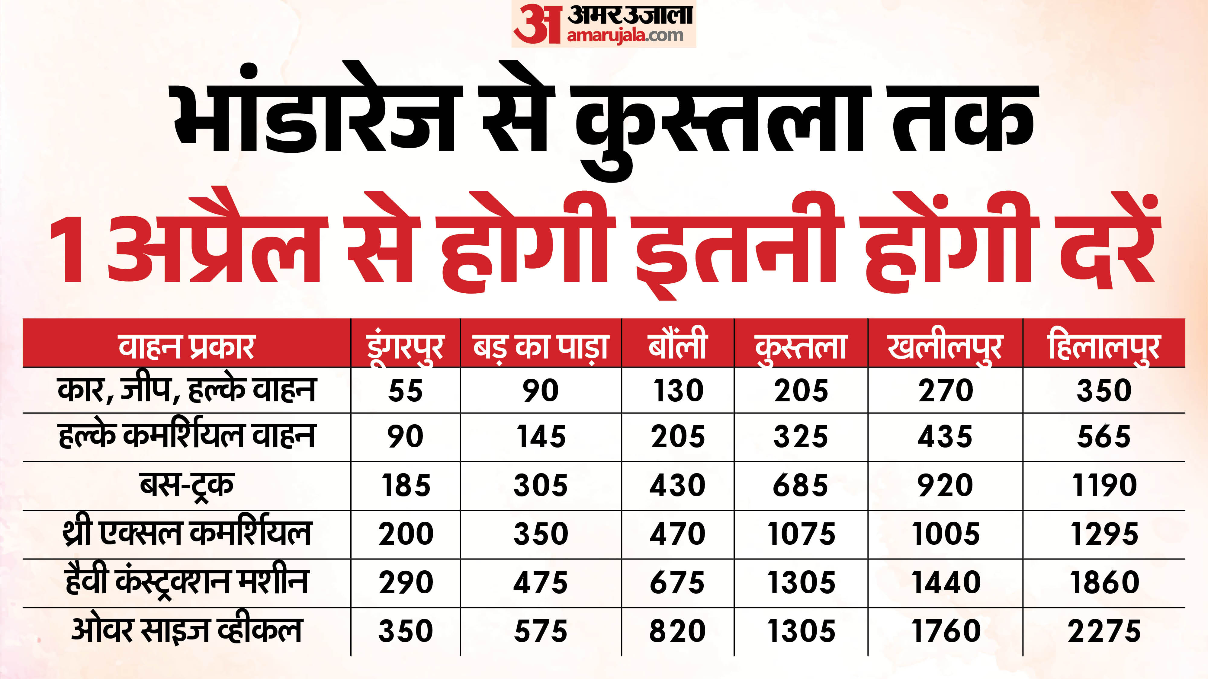 भांडारेज इंटरचेंज से कुस्तला तक के रूट पर कार और जीप चालकों को अब 160 रुपए की जगह 205 रुपए टोल चुकाना होगा। यानी इस रूट पर सीधे 45 रुपए की बढ़ोतरी हुई है। वहीं, हल्के वाणिज्यिक वाहनों के लिए टोल दर 260 रुपए से बढ़ाकर 325 रुपए कर दी गई है, जिसमें 65 रुपए की वृद्धि हुई है।