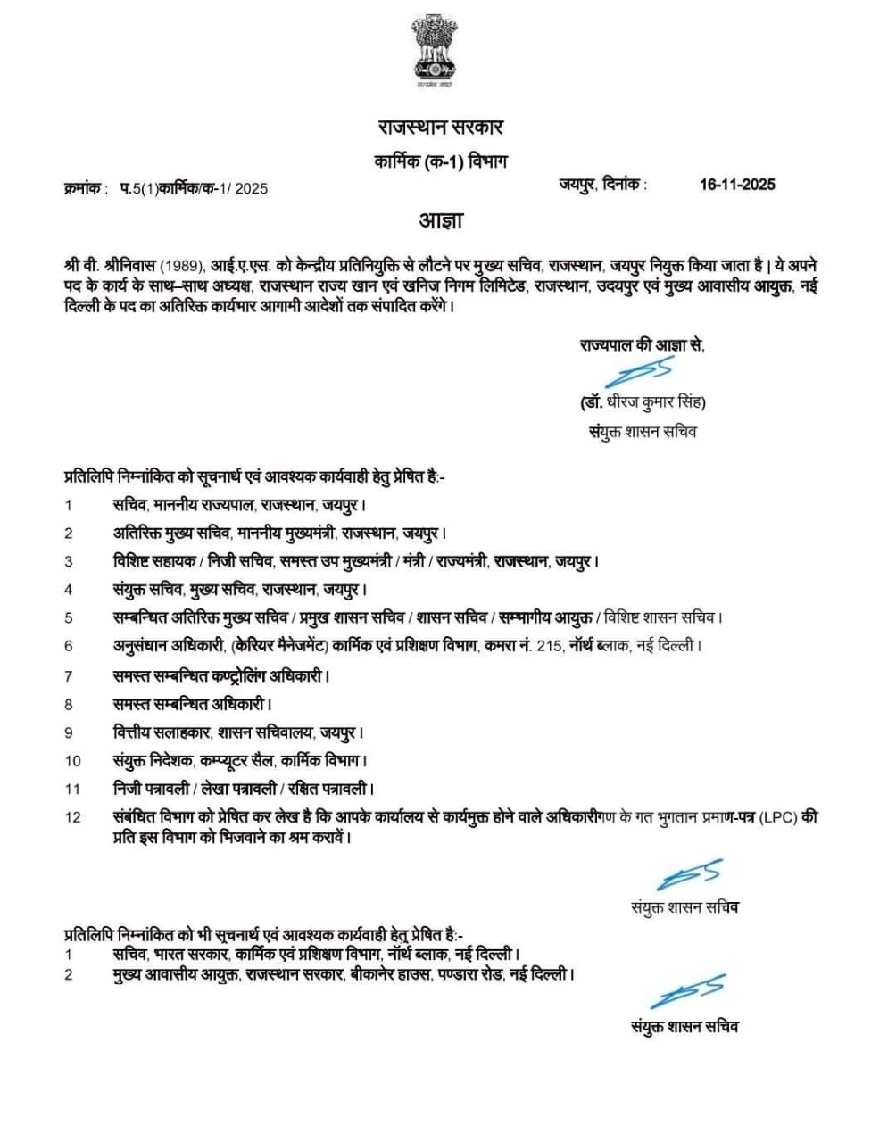वी. श्रीनिवास पिछले सात वर्षों से केंद्र सरकार में डेपुटेशन पर तैनात थे। रिलीव होने से पहले वे केंद्रीय प्रशासनिक सुधार, लोक शिकायत, पेंशन्स और पेंशनर्स कल्याण विभाग के सचिव के रूप में कार्यरत थे। उन्हें शुक्रवार शाम को केंद्र से राजस्थान भेजने की मंजूरी मिली थी। वे मुख्य सचिव के पद पर सितंबर 2026 तक सेवाएं देंगे।