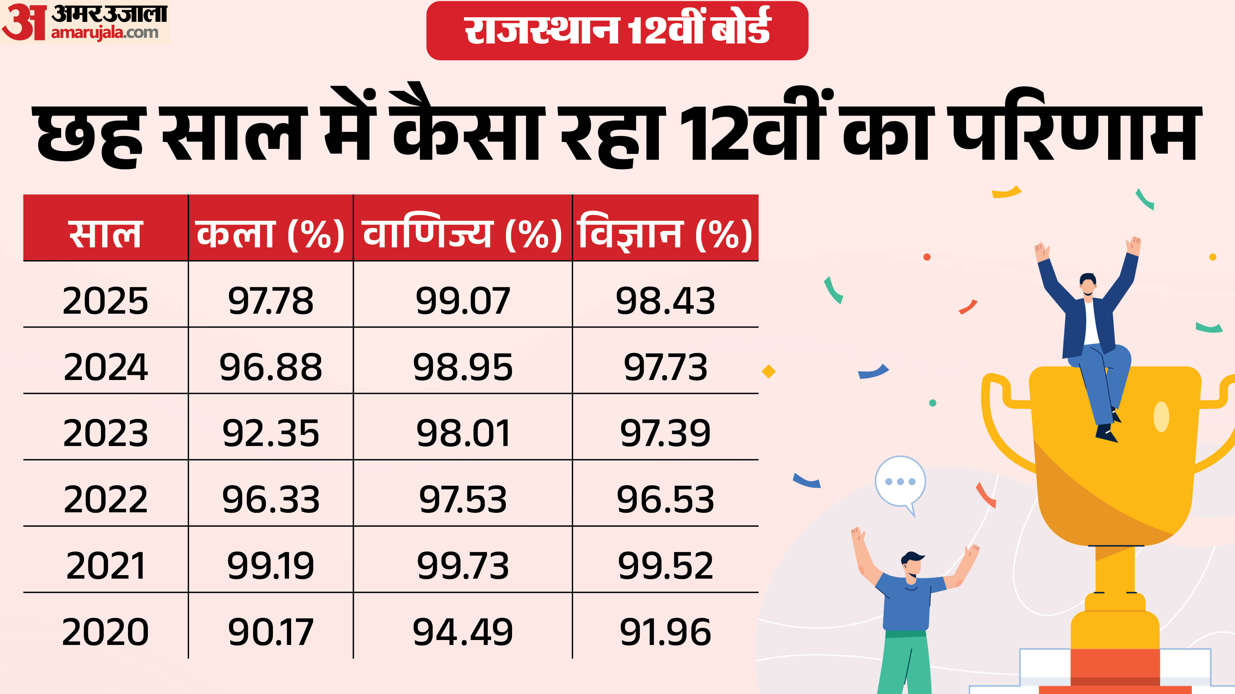 राजस्थान माध्यमिक शिक्षा बोर्ड (RBSE) की 12वीं कक्षा (कला, वाणिज्य और विज्ञान) का परिणाम मंगलवार सुबह करीब 10 बजे जारी किया गया। शिक्षा मंत्री मदन दिलावर ने परिणाम की घोषणा की। इस वर्ष (2026) का कुल परिणाम प्रतिशत पिछले वर्ष की तुलना में थोड़ा कम रहा। इस साल कला वर्ग का परिणाम 97.54%, वाणिज्य का 93.64% और विज्ञान का 97.52% रहा। वहीं, पिछले वर्ष (2025) कला का परिणाम 97.78%, वाणिज्य का 99.07% और विज्ञान का 98.43% दर्ज किया गया था।
