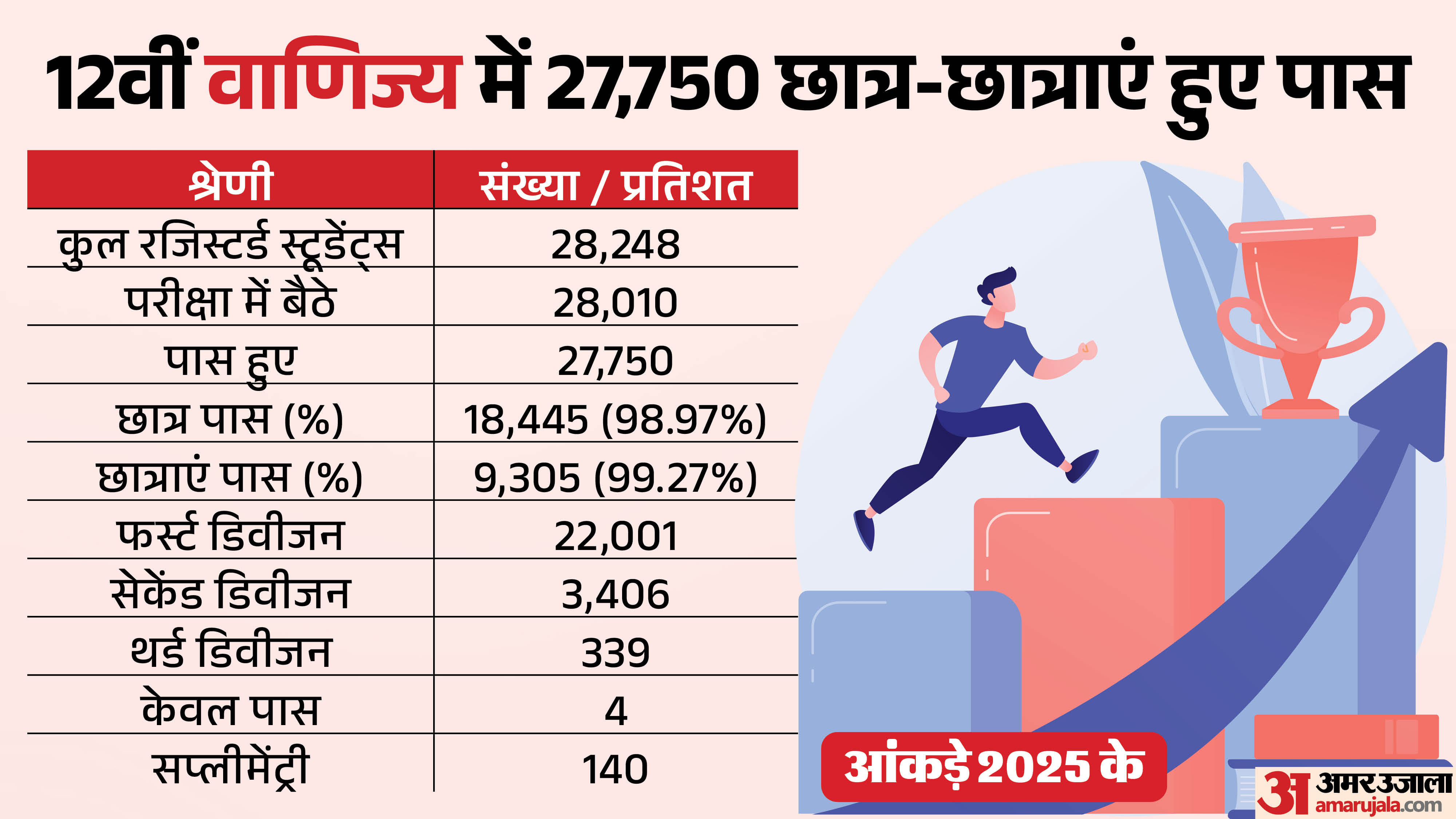 वाणिज्य में कुल 30798 स्टूडेंट रजिस्टर्ड थे, जिनमें से 30580 स्टूडेंट परीक्षा में शामिल हुए। वाणिज्य का परिणाम 93.64 प्रतिशत रहा। छात्रों के पास होने का प्रतिशत 94.04 और छात्राओं का पास होने का प्रतिशत 92.82 रहा। 20666 छात्रों में से 13976 लड़के और 9914 लड़कियों में से 8096 लड़कियां फर्स्ट डिवीजन से पास हुई हैं।