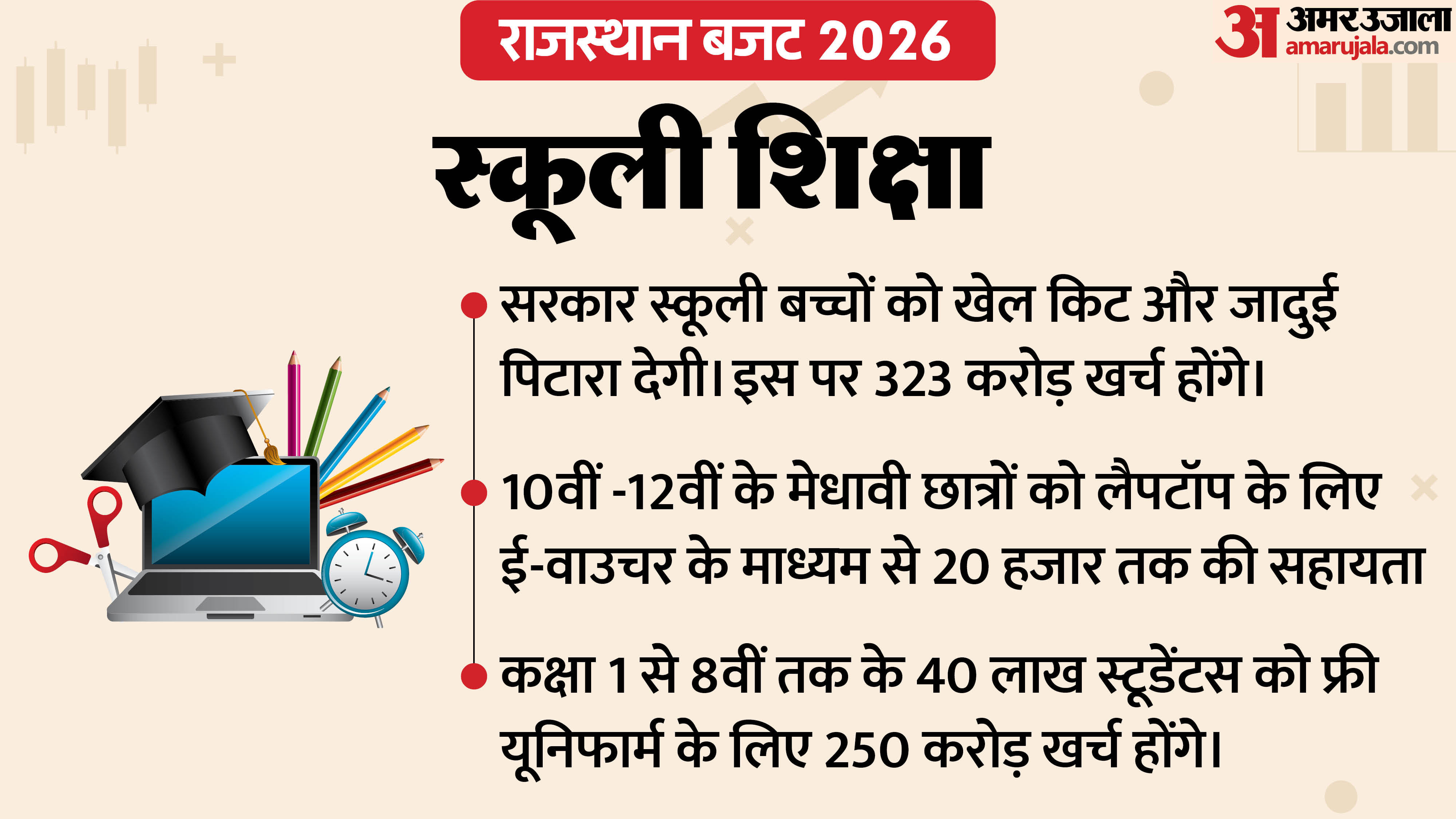 Rajasthan Budget 2026: राजस्थान बजट में महिलाओं, छात्रों, मरीजों और उद्योगों के लिए बड़ी घोषणाएं की गई हैं। कर्ज सीमा बढ़ी, मुफ्त इलाज और लैपटॉप सहायता मिलेगी, इंडस्ट्रियल पार्क बनेंगे और शहरों में आधारभूत ढांचा मजबूत होगा। ग्राफिक से समझें किसे क्या मिला।