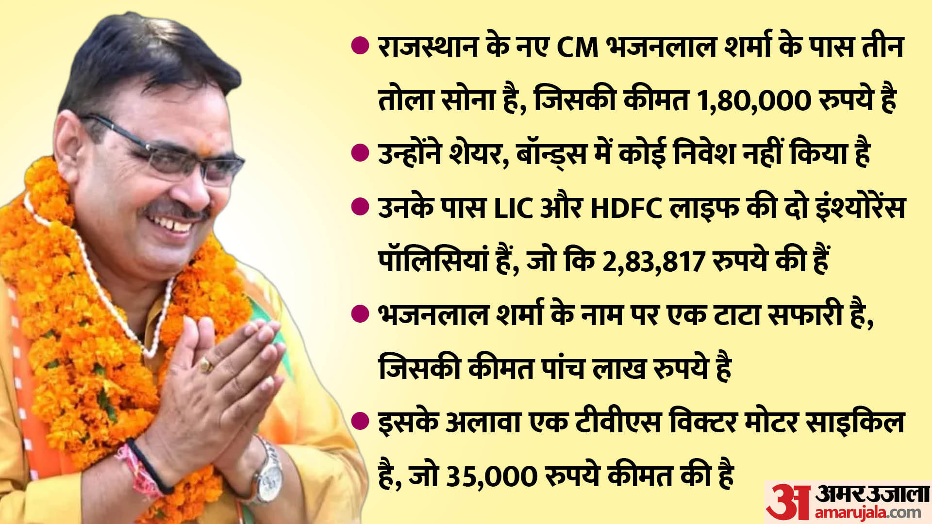 कीमती धातु की बात करें तो भजनलाल शर्मा के पास करीब तीन तोला सोना है, जिसकी कीमत 1,80,000 रुपये बताई गई है। उन्होंने शेयर और बॉन्ड में कोई निवेश नहीं किया है। हालांकि, भजनलाल के पास एलआईसी और एचडीएफसी की दो इंश्योरेंस पॉलिसी हैं।