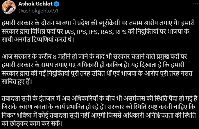 पूर्व सीएम अशोक गहलोत ने गुरुवार को IAS और IPS के तबादलों को लेकर मुख्यमंत्री भजनलाल पर तीखा हमला बोला। गहलोत ने अपने सोशल मीडिया अकाउंट एक्स पर लिखा- हमारी सरकार के दौरान भाजपा ने प्रदेश की ब्यूरोक्रेसी पर तमाम आरोप लगाए थे। हमारी सरकार द्वारा विभिन्न पदों पर IAS, IPS, IFS, RAS, RPS की नियुक्तियों पर भाजपा के साथी अनर्गल टिप्पणियां करते थे। आज सरकार के करीब 8 महीने हो जाने के बाद भी सरकार चलाने वाले प्रमुख पदों पर हमारी सरकार के समय लगाए गए अधिकारी ही काबिज हैं। यह दिखाता है कि हमारी सरकार द्वारा की गईं नियुक्तियां पूरी तरह उचित थीं एवं भाजपा के आरोप पूरी तरह गलत साबित हुए हैं। तबादला सूची के इंतजार में अब अधिकारियों के बीच भी असमंजस की स्थिति पैदा हो गई है जिसके कारण जनता के कार्य प्रभावित हो रहे हैं। सरकार को स्थिति स्पष्ट करनी चाहिए कि निकट भविष्य में कोई तबादला सूची नहीं आएगी जिससे अधिकारी अनिश्चिचतता की स्थिति को छोड़कर काम कर सकें।