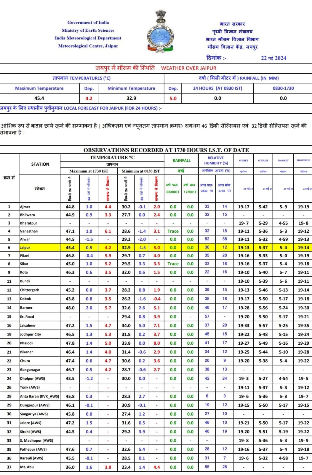 राजधानी जयपुर में अधिकतम तापमान 45.2 डिग्री सेल्सियस दर्ज किया गया। राजस्थान में माउंट आबू को छोड़कर शेष सभी वेदर स्टेशन्स पर तापमान 44 से 48 डिग्री के बीच ही रहा।