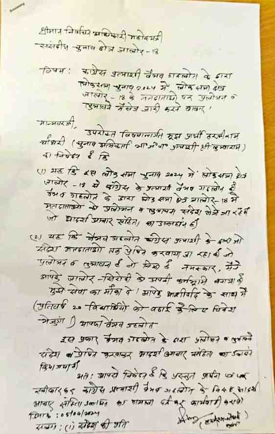 भाजपा प्रत्याशी के चुनाव अभिकर्ता ने उनके चुनाव प्रचार के दौरान मतदाताओं को पल्लवन देने का आरोप लगाते हुए लिखित शिकायत दर्ज करवाई है। शिकायत में बताया है कि आदर्श आचार संहिता का कांग्रेस प्रत्याशी वैभव गहलोत की ओर से उल्लंघन किया जा रहा है, जिसमें लोगों के मोबाइल पर एसएमएस के जरिए भेजे जा रहे मैसेज में लिखा है कि ''मैं आपके जालौर सिरोही को अपनी कर्मभूमि बनाया है। मुझे सेवा का मौका दें। आपके आशीर्वाद के साथ मैं प्रति वर्ष 20 विद्यार्थियों को पढ़ाई के लिए विदेश भेजूंगा'' इस मैसेज को लेकर जिला निर्वाचन अधिकारी को मतदाताओं को प्रलोभन देने के संबंध में लिखित शिकायत भी दर्ज करवाई गई है। ये शिकायत भाजपा के प्रत्याशी के चुनाव अभिकर्ता हरजीराम चौधरी ने लिखित में दर्ज करवाई है।