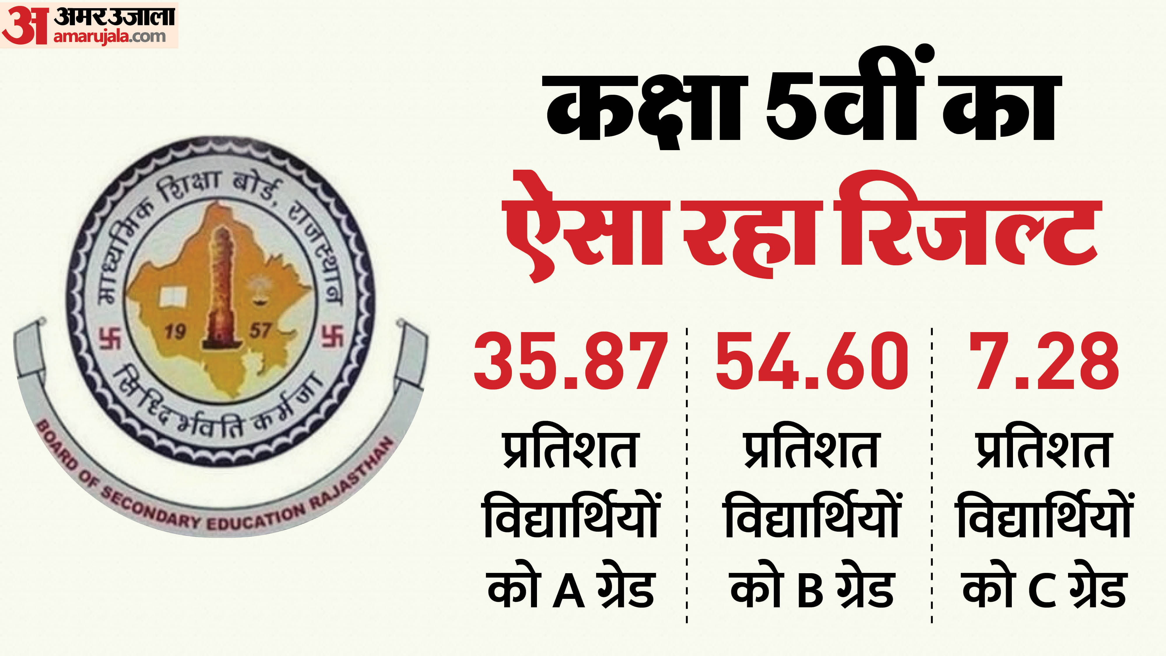 राजस्थान में कक्षा 5 और 8 के परीक्षा परिणाम 24 मार्च 2026 को जारी कर दिए गए हैं। इस बार दोनों कक्षाओं में छात्रों का प्रदर्शन बेहतर रहा है। कक्षा 5 में कुल 13 लाख 68 हजार से अधिक विद्यार्थी पंजीकृत थे, जिनमें से करीब 13 लाख 33 हजार छात्र परीक्षा में शामिल हुए। इनमें से 97.75 प्रतिशत छात्र उत्तीर्ण रहे, जो पिछले वर्ष के मुकाबले 0.28 प्रतिशत अधिक है। वहीं कक्षा 8 में लगभग 12 लाख 86 हजार छात्र पंजीकृत थे और करीब 12 लाख 45 हजार ने परीक्षा दी। इस कक्षा का कुल परिणाम 97.01 प्रतिशत रहा, जो पिछले साल से करीब 0.35 प्रतिशत ज्यादा है। कुल मिलाकर दोनों कक्षाओं का संयुक्त परिणाम 96.52 प्रतिशत रहा, जिसमें छात्राओं का प्रदर्शन छात्रों से बेहतर रहा। छात्राओं का रिजल्ट 97.57 प्रतिशत और छात्रों का 97.01 प्रतिशत दर्ज किया गया। इस बार करीब 30,640 विद्यार्थियों को सप्लीमेंट्री में रखा गया है, जिनकी परीक्षा जुलाई 2026 में आयोजित होगी।