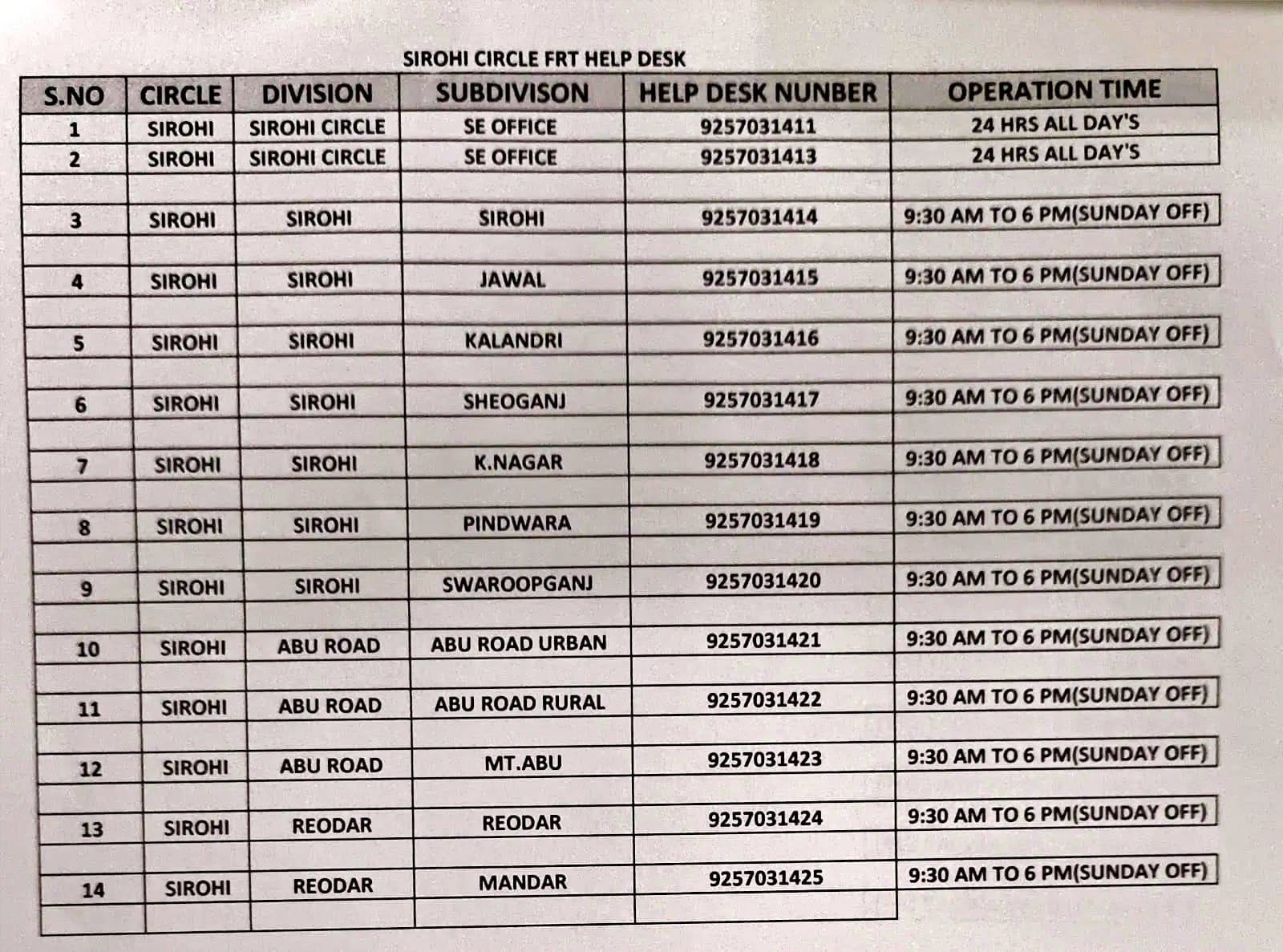 सिरोही जिले में बिजली उपभोक्ताओं की समस्याओं के त्वरित निस्तारण के लिए डिस्कॉम प्रशासन द्वारा जिला एवं उपखंड स्तर पर कंट्रोल रूम स्थापित किए गए हैं। नई व्यवस्था के तहत उपभोक्ता उपखंड स्तर पर रविवार को छोड़कर प्रतिदिन सुबह 9.30 बजे से शाम 6 बजे तक अपनी शिकायत दर्ज करवा सकेंगे।