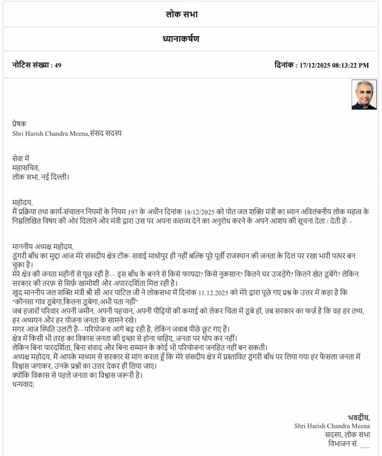 टोंक–सवाई माधोपुर के सांसद हरीशचंद्र मीना ने प्रस्तावित डूंगरी बांध परियोजना को लेकर केंद्र सरकार की कार्यप्रणाली पर गंभीर सवाल उठाए हैं। लोकसभा की कार्य-संचालन नियमावली के नियम 197 के तहत ध्यानाकर्षण प्रस्ताव लाकर उन्होंने केंद्रीय जल शक्ति मंत्री से परियोजना की स्थिति स्पष्ट करने की मांग की।