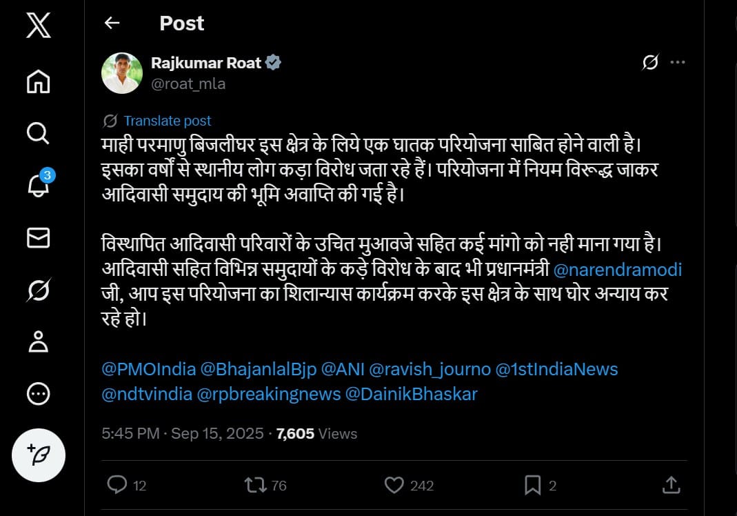 दरअसल, सांसद रोत ने सोशल मीडिया X पर लिखा था कि माही परमाणु बिजलीघर इस क्षेत्र के लिए एक घातक परियोजना साबित होने वाली है। इसका वर्षों से स्थानीय लोग कड़ा विरोध जता रहे हैं। परियोजना में नियम विरुद्ध जाकर आदिवासी समुदाय की भूमि अवाप्ति की गई है। विस्थापित आदिवासी परिवारों के उचित मुआवजे सहित कई मांगों को नहीं माना गया है। आदिवासी सहित विभिन्न समुदायों के कड़े विरोध के बाद भी प्रधानमंत्री @narendramodi जी, आप इस परियोजना का शिलान्यास कार्यक्रम करके इस क्षेत्र के साथ घोर अन्याय कर रहे हो।