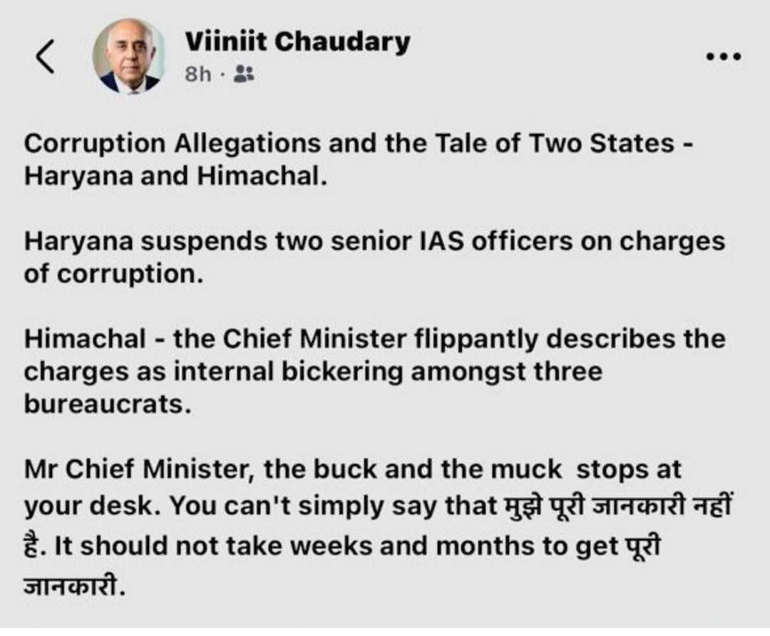 पूर्व मुख्य सचिव ने सोशल मीडिया में अपलोड की गई पोस्ट में लिखा कि हरियाणा में भ्रष्टाचार के गंभीर आरोप सामने आते ही सरकार ने दो वरिष्ठ आईएएस अधिकारियों को निलंबित कर सख्त संदेश दिया, जबकि हिमाचल प्रदेश में उसी तरह के आरोपों को अंदरूनी खींचतान बताकर टालने की कोशिश की जा रही है।