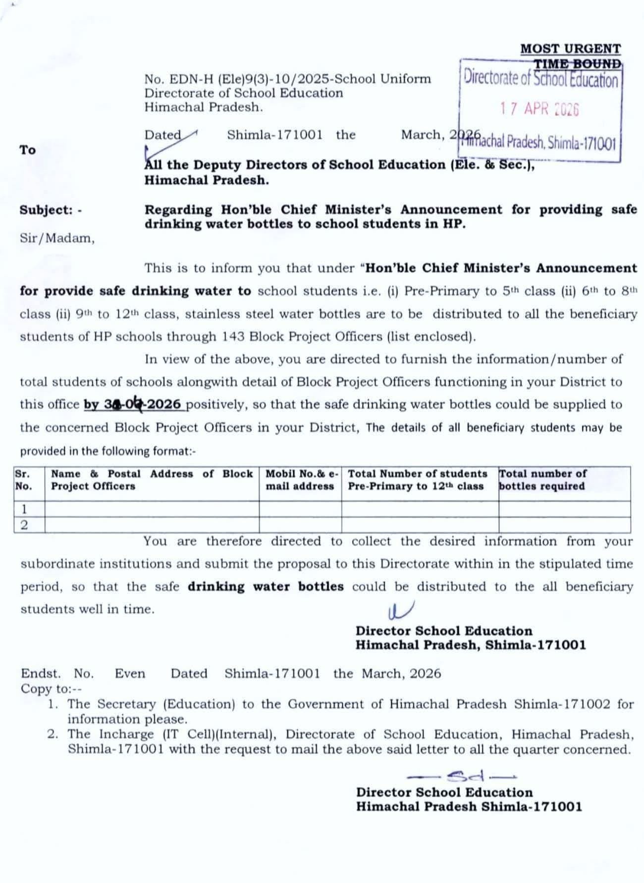 इस योजना का मुख्य उद्देश्य प्लास्टिक प्रदूषण को कम करना और बच्चों को सुरक्षित तथा पर्यावरण-अनुकूल विकल्प उपलब्ध कराना है। सभी उपनिदेशकों को निर्देश दिए गए हैं कि वे अपने जिले में कार्यरत 143 ब्लॉक प्रोजेक्ट अधिकारियों की सूची, उनके मोबाइल नंबर, ईमेल पता, कुल छात्र संख्या (प्री-प्राइमरी से 12वीं तक) तथा आवश्यक बोतलों की संख्या की जानकारी 30 अप्रैल 2026 तक निदेशालय को उपलब्ध कराएं।