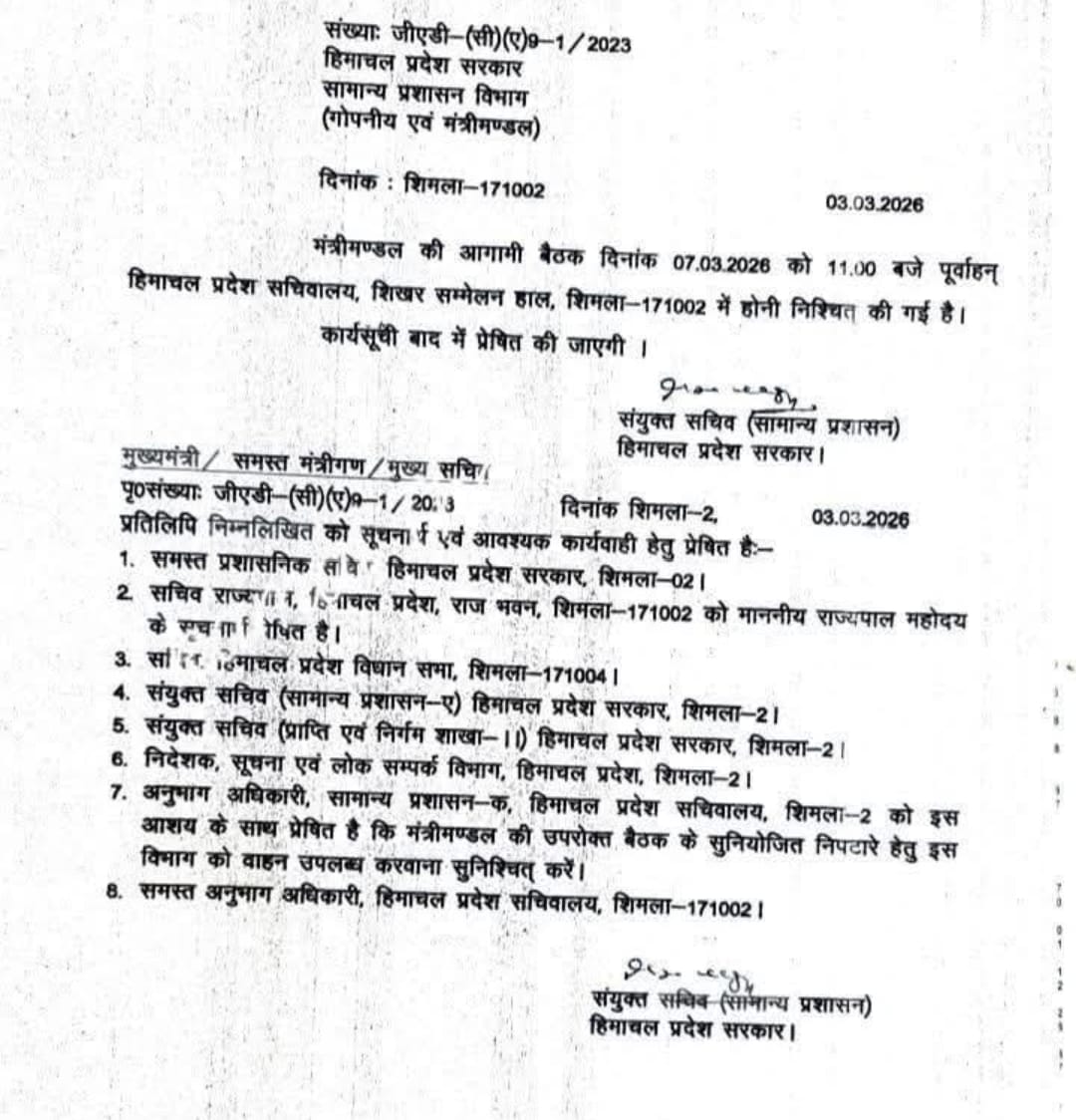 मुख्यमंत्री सुखविंद्र सिंह सुक्खू की अध्यक्षता में सात मार्च को हिमाचल प्रदेश मंत्रिमंडल की बैठक होगी।