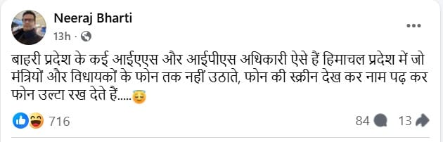 वहीं कृषि मंत्री चंद्र कुमार के पुत्र पूर्व मुख्य संसदीय सचिव नीरज भारती ने भी विक्रमादित्य सिंह के बयान के समर्थन में पोस्ट की है। उन्होंने लिखा, 'बाहरी प्रदेश के कई आईएएस और आईपीएस अधिकारी ऐसे हैं, हिमाचल प्रदेश में जो मंत्रियों और विधायकों के फोन तक नहीं उठाते, फोन की स्क्रीन देख कर नाम पढ़कर फोन उल्टा रख देते हैं।' इससे पहले बुधवार को एक और पोस्ट में नीरज भारती ने लिखा था, 'सभी तो नहीं लेकिन 60-70 प्रतिशत बाहर के अधिकारी ऐसे हैं जिन्हें हिमाचल प्रदेश या हिमाचलियों के हितों से कोई सरोकार नहीं है, कांग्रेसियों को याद होगा जब विपक्ष में थे तो एक उच्च आईपीएस अधिकारी पर पुलिस भर्ती घोटाले का आरोप लगाया था, जब कभी भी कांग्रेस या कांग्रेस के फ्रंटल संगठन विधानसभा घेराव करते थे तो वही उच्च आईपीएस अधिकारी लाठीचार्ज भी करवाता था कांग्रेसियों पर, लेकिन कांग्रेस की सरकार बनने के बाद मजे से पूरा समय काट कर ठाठ से रिटायर हो कर गया..... पता नहीं सरकार बनने के बाद उस अधिकारी के खिलाफ किया गया कांग्रेसियों का विरोध प्रदर्शन कहां गया।'