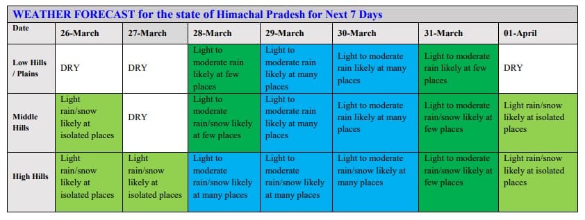 माैसम विज्ञान केंद्र शिमला के अनुसार राज्य में 28 मार्च से 3 अप्रैल तक बारिश-बर्फबारी होने का पूर्वानुमान है। हालांकि, 1 अप्रैल को उच्च पर्वतीय कुछ क्षेत्रों में ही हल्की बारिश-बर्फबारी हो सकती है। जबकि 31 मार्च को कुछ स्थानों पर और 28 से 30 मार्च तथा 2 और 3 अप्रैल को राज्य के कई स्थानों पर हल्की से मध्यम बारिश-बर्फबारी होने के आसार हैं। इसके अलाव 28 से 30 मार्च और 2-3 अप्रैल को 40-50 किलोमीटर प्रतिघंटे की रफ्तार से अंधड़ चलने का येलो अलर्ट जारी किया गया है। वहीं चंबा, कांगड़ा, कुल्लू, मंडी व शिमला जिले के लिए 29 मार्च को ओलावृष्टि व अंधड़ का ऑरेंज अलर्ट जारी किया गया है।