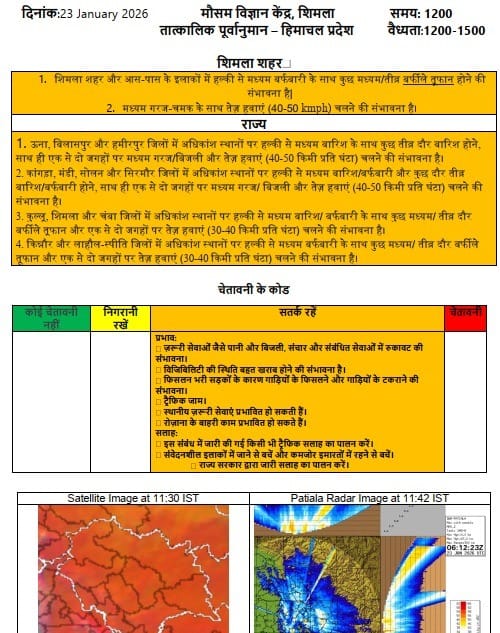 विभाग के अनुसार 23 और 27 जनवरी को राज्य के ज्यादातर हिस्सों में हल्की से मध्यम बारिश-बर्फबारी होने की संभावना है और कुछ जगहों पर भारी बारिश-बर्फबारी का येलो अलर्ट है। 24 और 25 जनवरी को ऊंची पहाड़ियों पर कुछ जगहों पर हल्की बारिश-बर्फबारी होगी। 26 और 28 जनवरी को राज्य के कुछ हिस्सों में हल्की से मध्यम बारिश-बर्फबारी होने के आसार हैं। 29 जनवरी को मौसम साफ रहने के आसार हैं। 24 व 25 जनवरी को कुछ स्थानों पर शीतलहर चलने का येलो अलर्ट है।