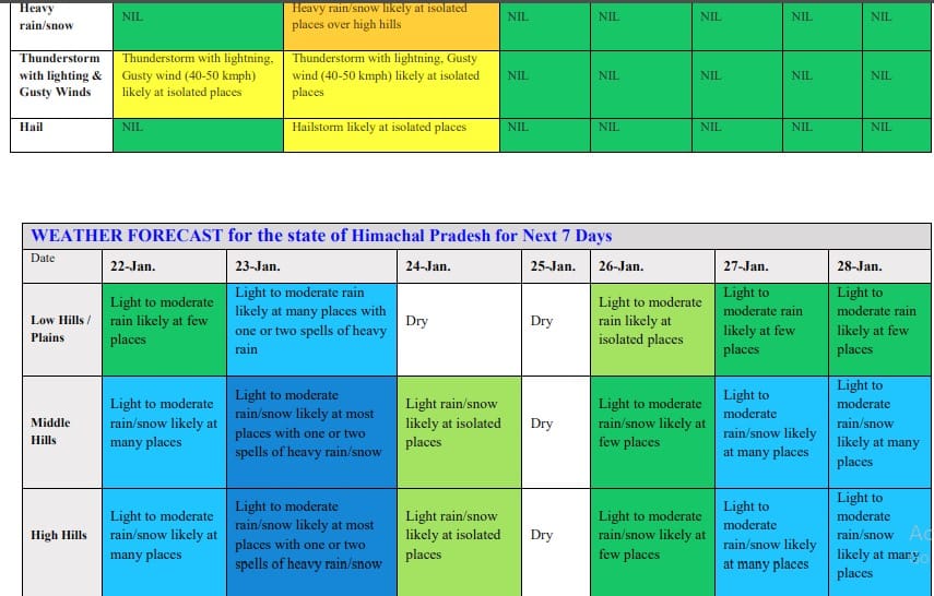 माैसम विज्ञान केंद्र शिमला के अनुसार 24 जनवरी को ऊंची पहाड़ियों पर कुछ जगहों पर हल्की बारिश-बर्फबारी होने की संभावना है। 25 जनवरी को राज्य में मौसम साफ रहेगा। 26 जनवरी को राज्य में कुछ जगहों पर हल्की से मध्यम बारिश-बर्फबारी होने के आसार हैं। 22, 27 और 28 जनवरी को राज्य में कई स्थानों और 23 जनवरी को ज्यादातर जगहों पर हल्की से मध्यम बारिश-बर्फबारी होने का पूर्वानुमान है। साथ ही 23 जनवरी को ऊंचे पहाड़ी इलाकों में कुछ जगहों पर भारी बारिश-बर्फबारी होने का ऑरेंज अलर्ट जारी किया गया है।