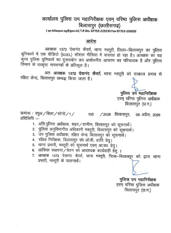 पूरा मामला छत्तीसगढ़ के बिलासपुर जिले का है, जहां आरक्षक देवानंद कैवर्त पुलिस वर्दी में रील बनाकर सोशल मीडिया पर वायरल कर दिया। वीडियो के वायरल होते ही वरिष्ठ अधिकारियों की नजर इस पर पड़ी और उन्होंने इसे अपने संज्ञान में लिया।  एसएसपी रजनेश सिंह ने आदेश जारी कर आरक्षक देवानंद कैवर्त को मस्तूरी थाने से हटाकर रक्षित केंद्र, बिलासपुर अटैच कर दिया है। यह आदेश तत्काल प्रभाव से लागू हो गया है।