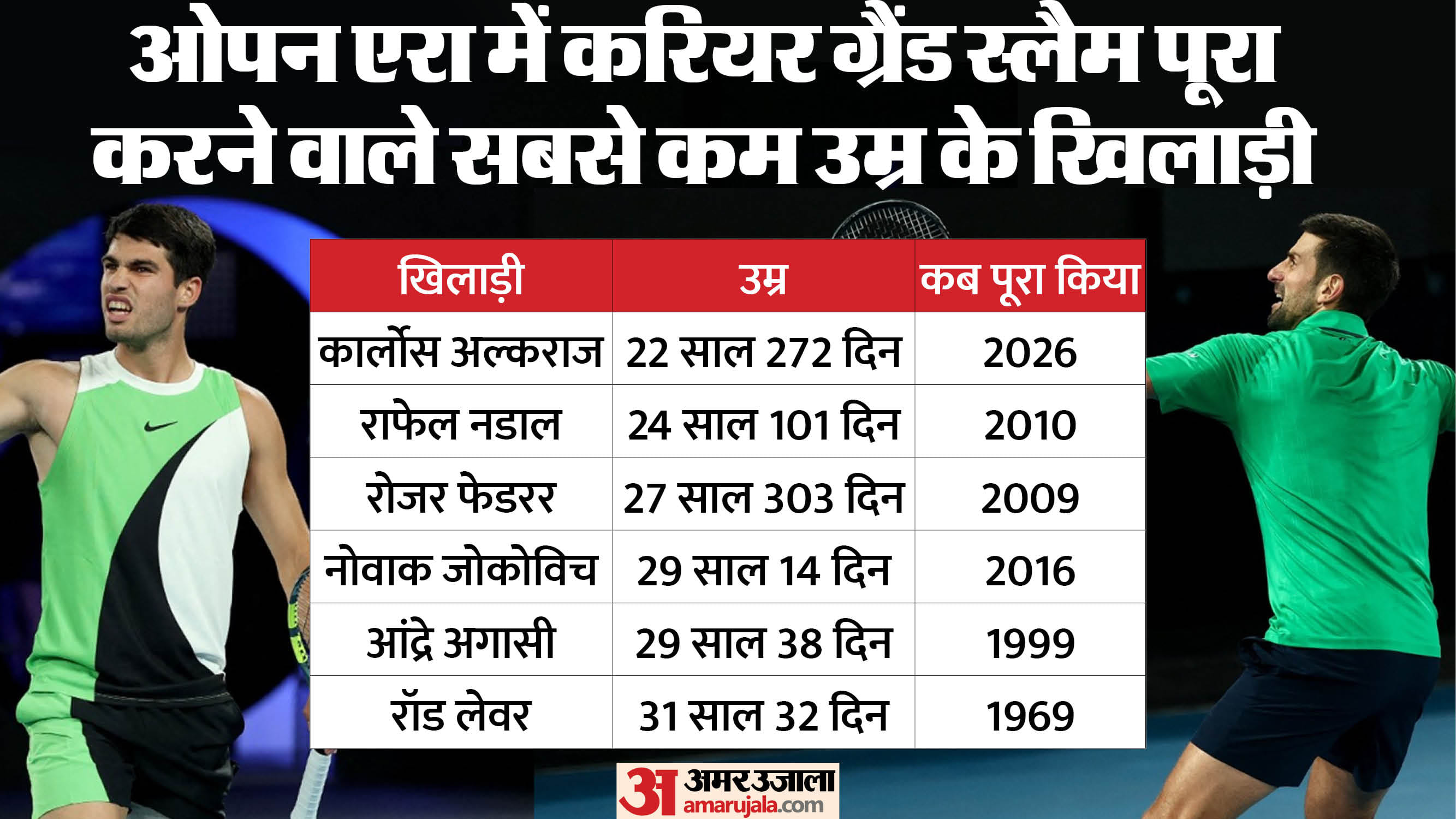 - विंबलडन, फ्रेंच ओपन और यूएस ओपन जीत चुके अल्काराज अब ऑस्ट्रेलियन ओपन चैंपियन बनने के साथ ही ओपन एरा में करियर ग्रैंड स्लैम पूरा करने वाले छठे पुरुष खिलाड़ी बने।