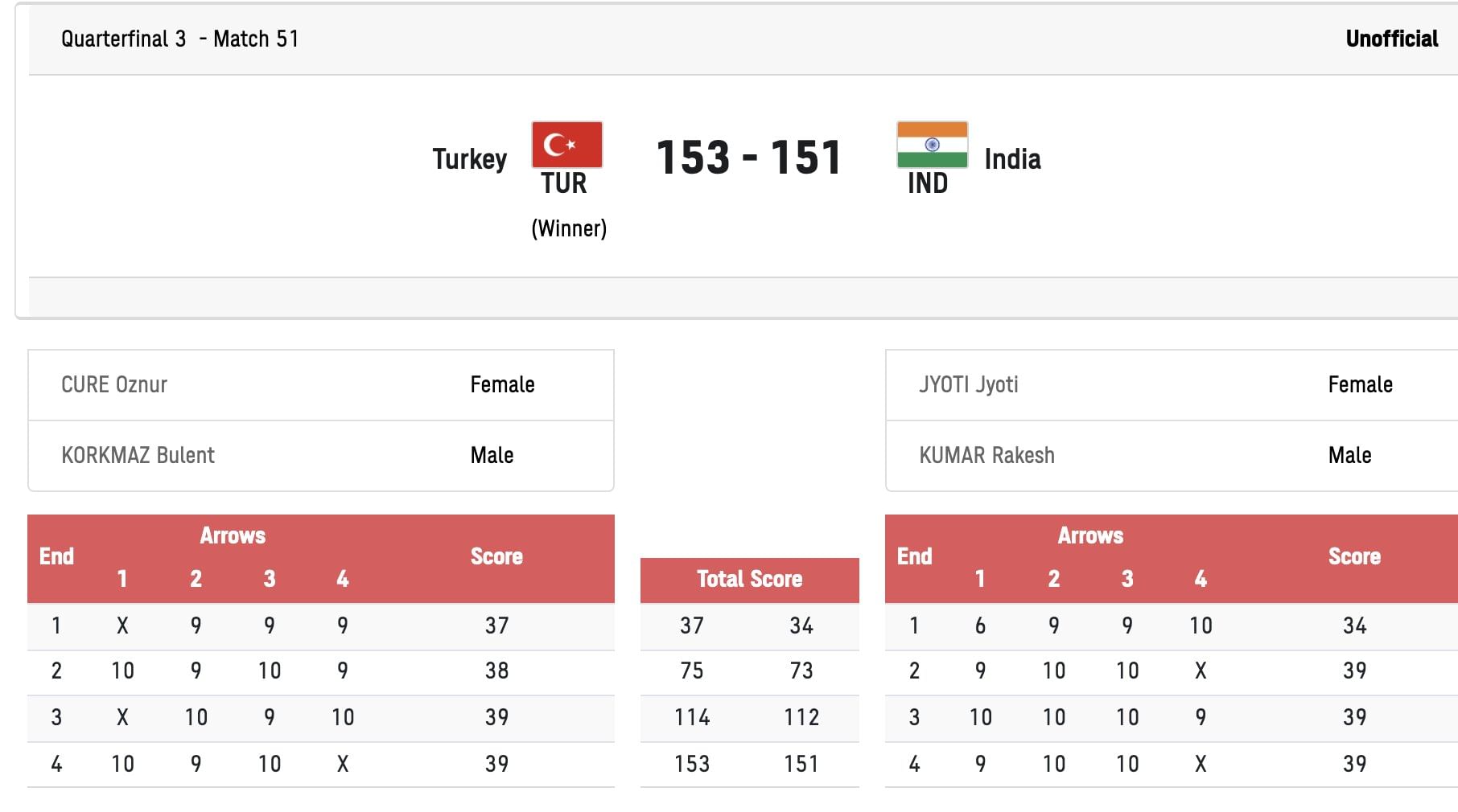 #IND's Jyoti Balyan and Rakesh Kumar are stopped in their tracks by #TUR's Oznur Cure and Bulent Korkmaz, who beat them 153-151 in the #ParaArchery Mixed Team quarterfinals!#Tokyo2020 #Paralympics