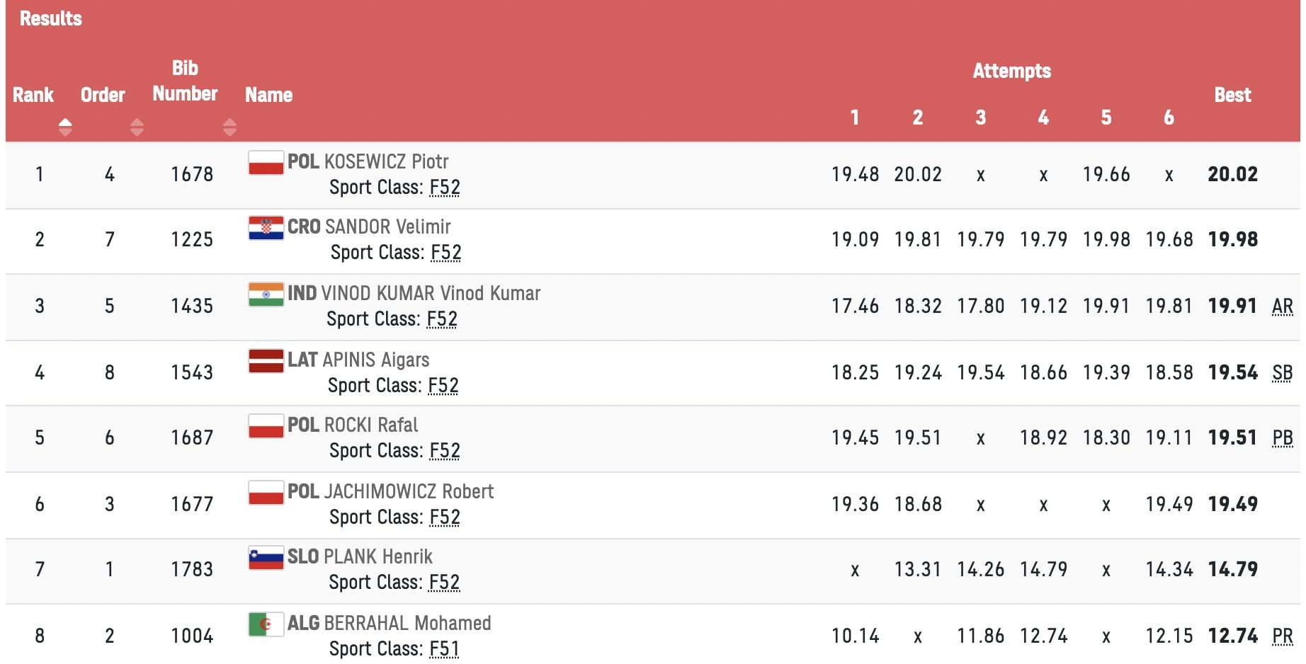 पुरुषों की डिस्कस थ्रो एफ-52 फाइनल स्पर्धा में विनोद कुमार ने 19.91 का थ्रो कर कांस्य पदक अपने नाम किया। इसी के साथ एक दिन में भारत के खाते में तीन पदक आए।