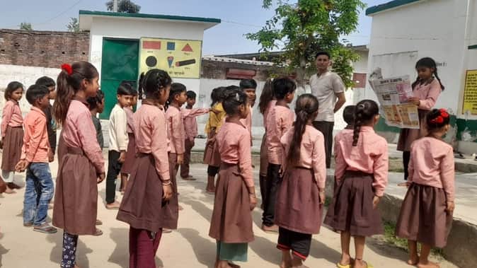 UP News: तराई के स्कूलों में अखबार से हुई पढ़ाई की शुरुआत, विद्यार्थियों ने पढ़ा 'अमर उजाला'; तस्वीरें