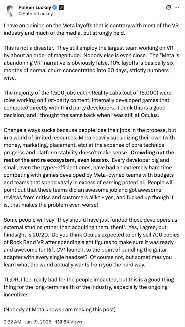 सोशल मीडिया प्लेटफॉर्म एक्स पर एक लंबी पोस्ट में लकी ने कहा कि उनका नजरिया वीआर इंडस्ट्री और मीडिया में चल रही आम धारणा से अलग है। उन्होंने लिखा, 'यह कोई आपदा नहीं है। मेटा के पास अब भी वीआर पर काम करने वाली सबसे बड़ी टीम है और कोई भी इसके आसपास भी नहीं है।'