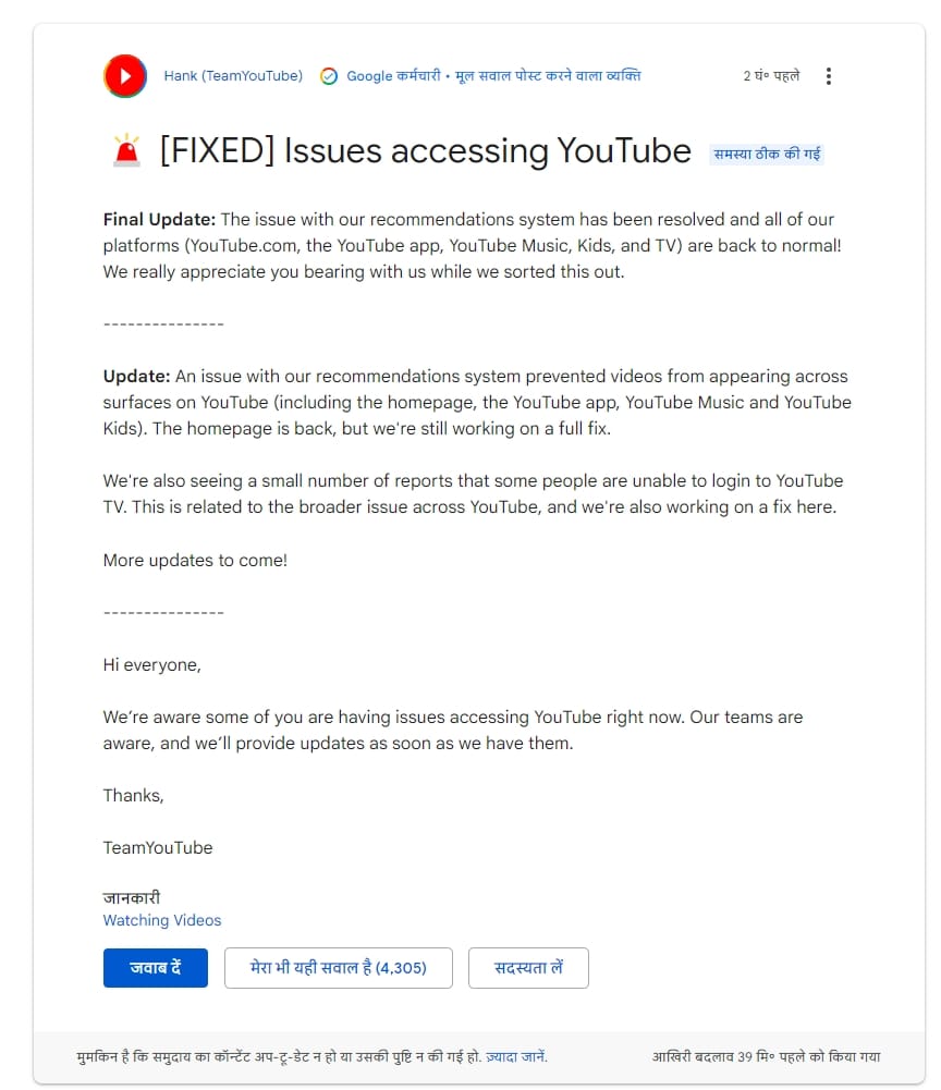 तकनीकी गड़बड़ी संबंधी शिकायतों की बाढ़ आने के बाद गूगल ने एक बयान में कहा, 'कुछ यूजर्स को यूट्यूब एक्सेस करने में दिक्कतें हो रही हैं। हमारी टीम परेशानी को दूर करने में जुटी है। जैसे ही अपडेट मिलेगा, कंपनी सूचना साझा करेगी।' कई यूजर्स ने भारतीय समयानुसार बुधवार सुबह करीब 9 बजे सेवाओं के बहाल होने की बातें भी कहीं। यूट्यूब की तरफ से भी कहा गया कि अधिकांश समस्याएं दूर हो चुकी हैं।