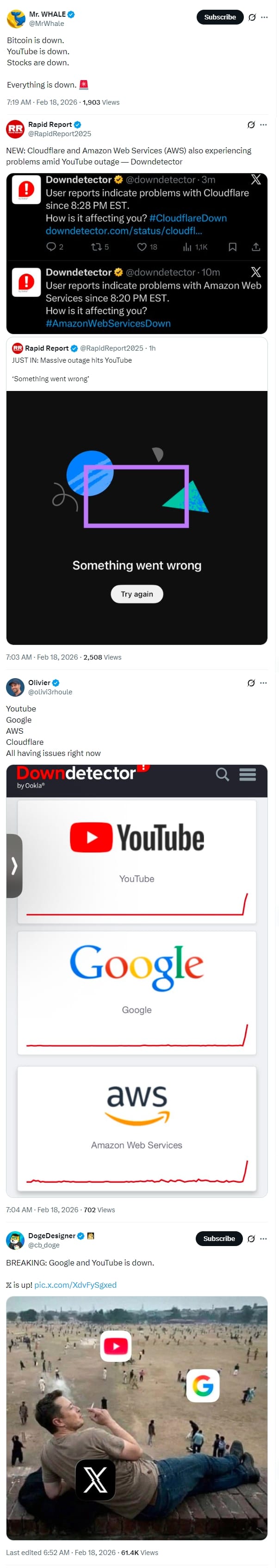 यूट्यूब सेवाओं पर असर को लेकर डाउनडिटेक्टर के हवाले से आई मीडिया रिपोर्ट्स में कहा गया कि मंगलवार शाम अमेरिका में लाखों लोगों ने तकनीकी दिक्कतों की सूचना दी। वीडियो प्लेटफॉर्म के हजारों यूजर्स ने मंगलवार शाम करीब आठ बजे (अमेरिकी समय) कहा कि वे वीडियो नहीं देख पा रहे हैं। कंपनी के मुताबिक इस व्यापक तकनीकी गड़बड़ी के कारणों की पड़ताल की जा रही है। रॉयटर्स की रिपोर्ट के मुताबिक वेबसाइट्स और सर्वर में खामियों पर नजर रखने वाली वेबसाइट डाउनडिटेक्टर ने अमेरिकी समयानुसार मंगलवार रात करीब आठ बजे तक 2.40 लाख शिकायतें दर्ज किए जाने की पुष्टि की।
