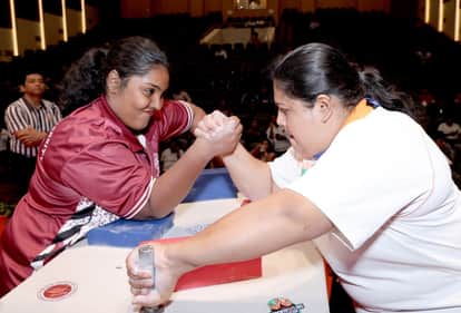 आर्म रेसलिंग चैंपियनशिप में प्रतिभाग करते खिलाड़ी।