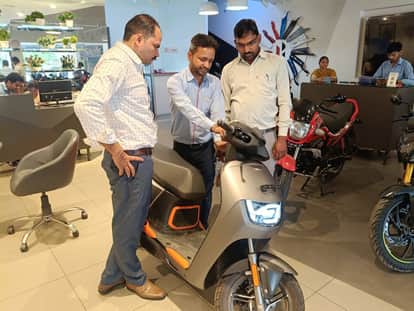 इलेक्ट्रिक स्कूटर शोरूम पर ग्राहकों को स्कूटर के विषय में बताता सेल्समैन ।