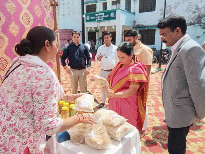 कृषक गोष्ठी में स्टॉल का निरीक्षण करतीं जिला पंचायत अध्यक्ष विजय सिंह व अन्य।