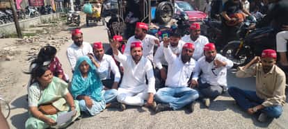 सड़क पर बैठकर प्रदर्शन करते सपाई।