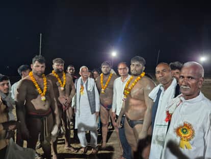 कुश्ती दंगल में पहलवानों के साथ आयोजक व निर्णायक मंडल के सदस्य।