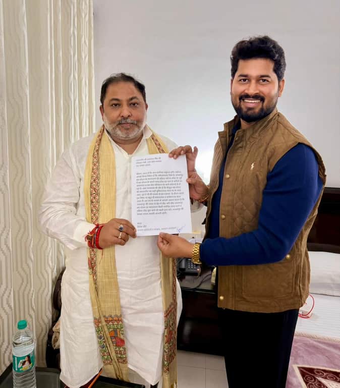 .परिवहन दयाशंकर सिंह को मांगपत्र सौंपते हुए भाजपा नेता विवेक मौर्य।