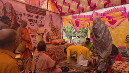 टांडा क्षेत्र के गोवर्धनपुर में चरण पादुका पूजन के दौरान मौजूद शंकराचार्य स्वामी अविमुक्तेश्वरा