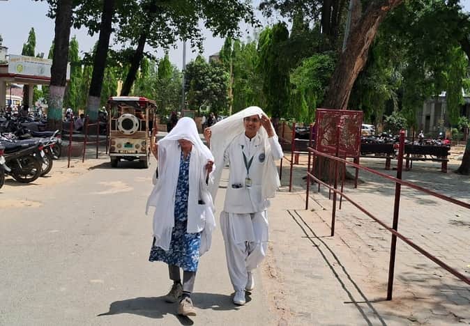 तेज धूप से बचने के लिए शनिवार को दुपट्टे से सिर ढक कर निकलती युवतियां। संवाद