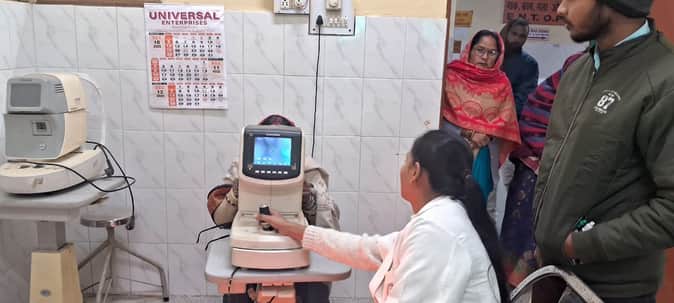 जिला अस्पताल की ओपीडी में महिला मरीज की मशीन के माध्यम से आंख की जांच करतीं स्वास्थ्यकर्मी।